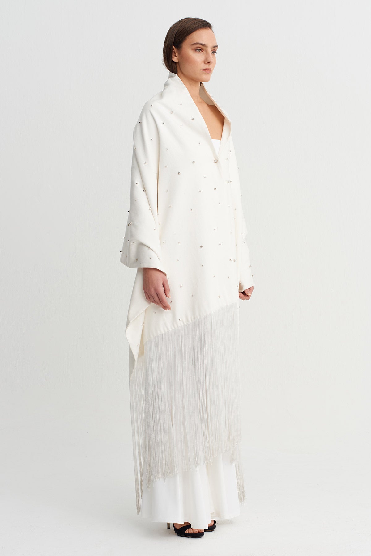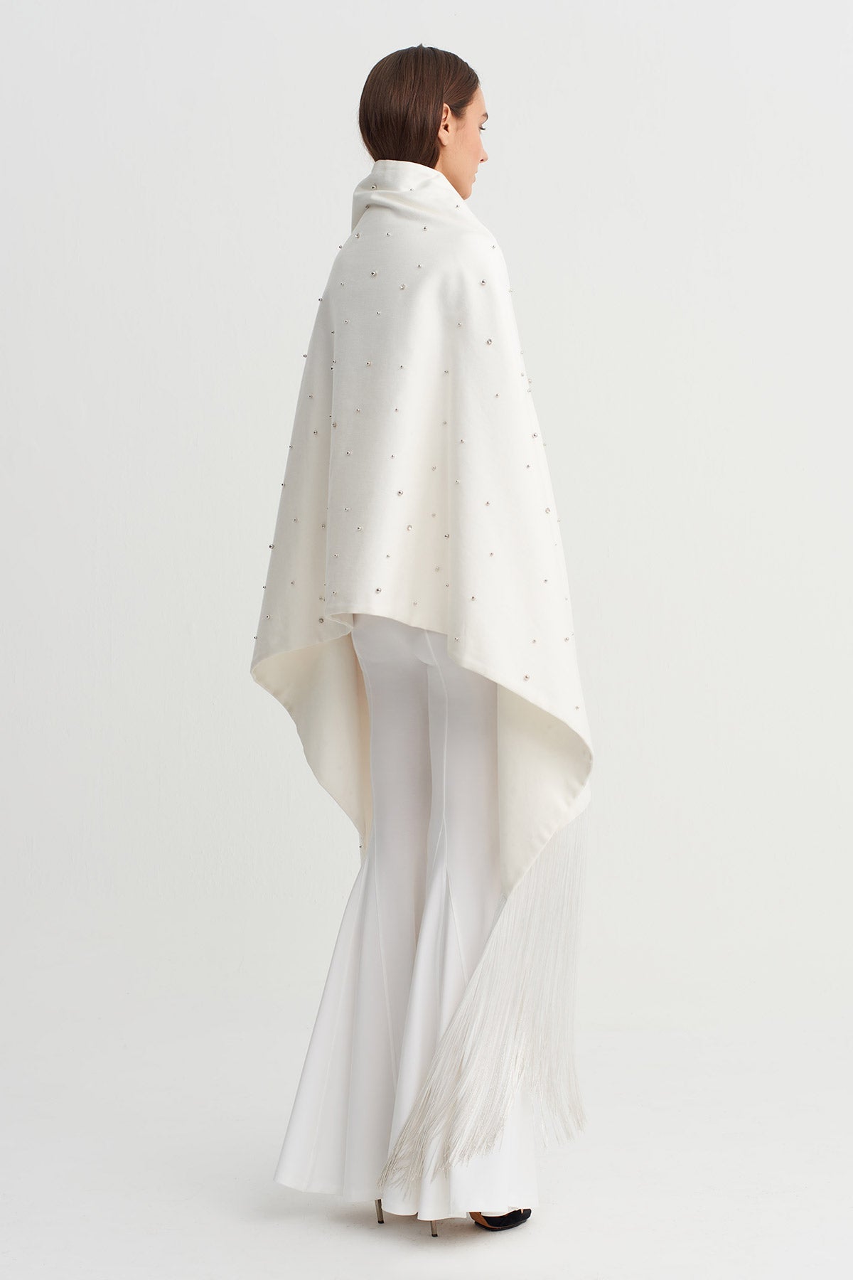 Distinguished by its fluid form and elegant drape, this cape shawl transforms understated sophistication into a powerful statement with its scattered stone embellishments. Its asymmetrical cut and long tassel details at the hem add movement, while its flowing, relaxed fit makes it easily adaptable to various outfits. It can be worn as a shawl over dresses and suits, or as a cape for special occasions, completing your style. Designed for those seeking a timeless and bold look.