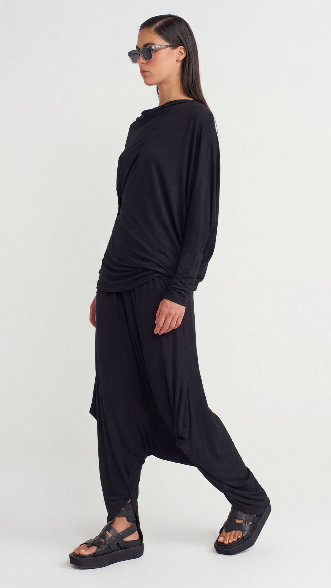 Black Asymmetrical Draped Jersey Dress - Y264014013